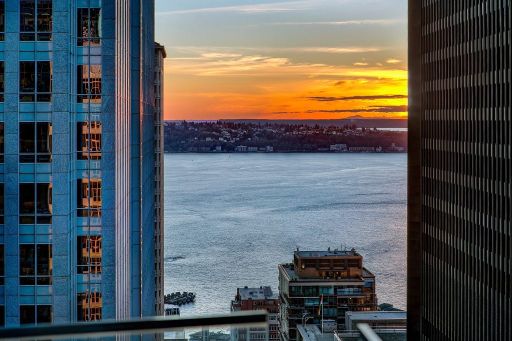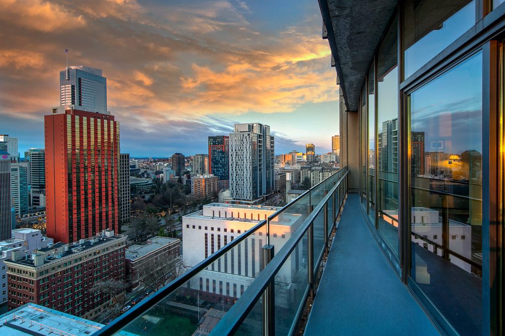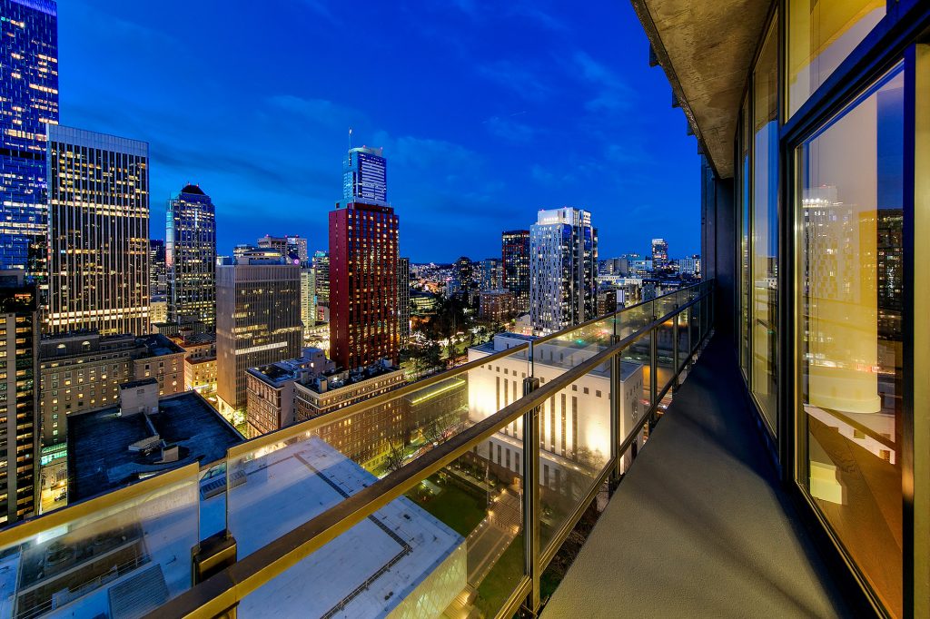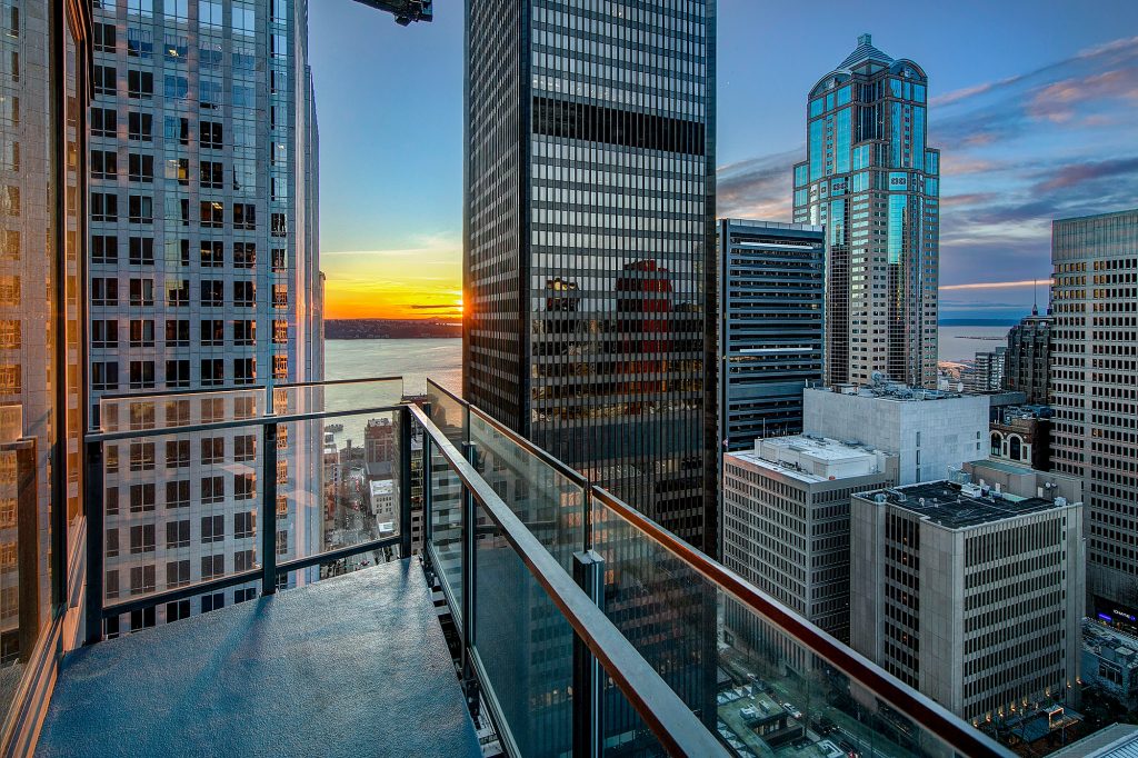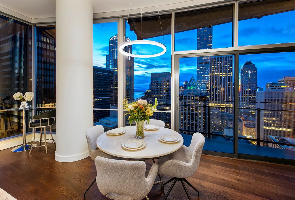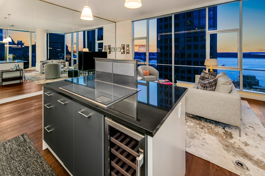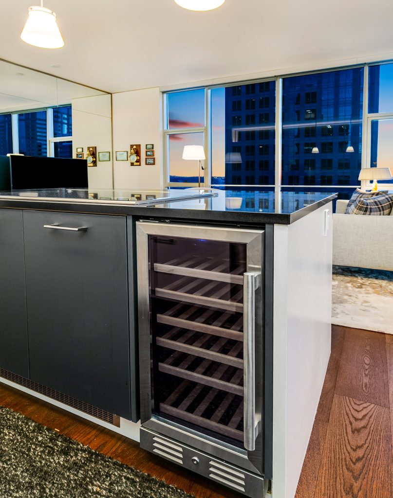 Penthouse Style luxury from this 23rd floor NW corner Jewel box! Near 1250 sqft -1bd plus large den. Soaring 11 foot floor to ceiling windows wrap this private sub penthouse home. Dream remodel, enjoy over 100k of designer upgrades, new wide plank floors, cook with a view-custom island designed with new wolf induction cook top, discreet pop up fan & sleek beverage center. Top of the line appliances, subzero, new LED lighting in kitchen above & below cabinets new designer lighting in dining area, new kitchen granite, sink & faucet, new Bosh dishwasher. Home has A/C . World class building, 24story, 126 homes, only 6 per floor, LEED Gold, steel & concrete. 5star location, mins to stadiums, I5, light rail, hospitals, court house. 1 parking- 1 storage. Be sure to visit 2nd floor amenities, owners lounge with roof deck, guest suite, fitness center & pet relief. Great HOA with healthy reserves! No rent cap.