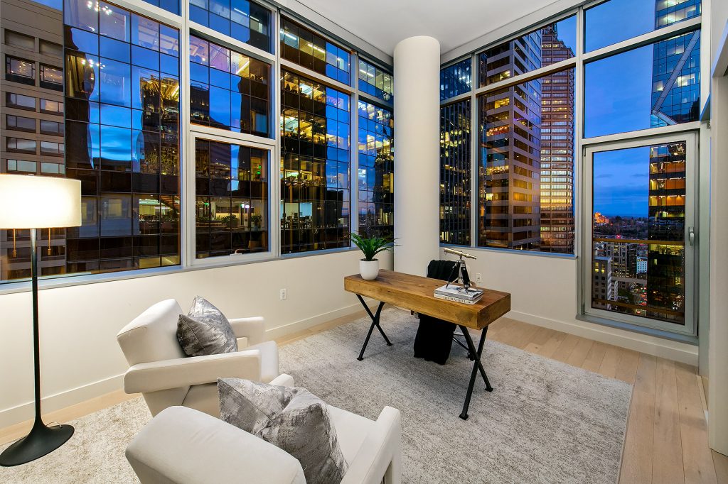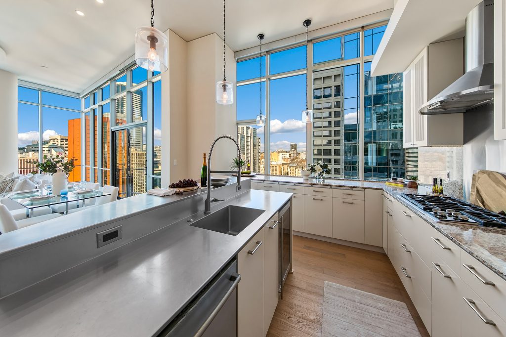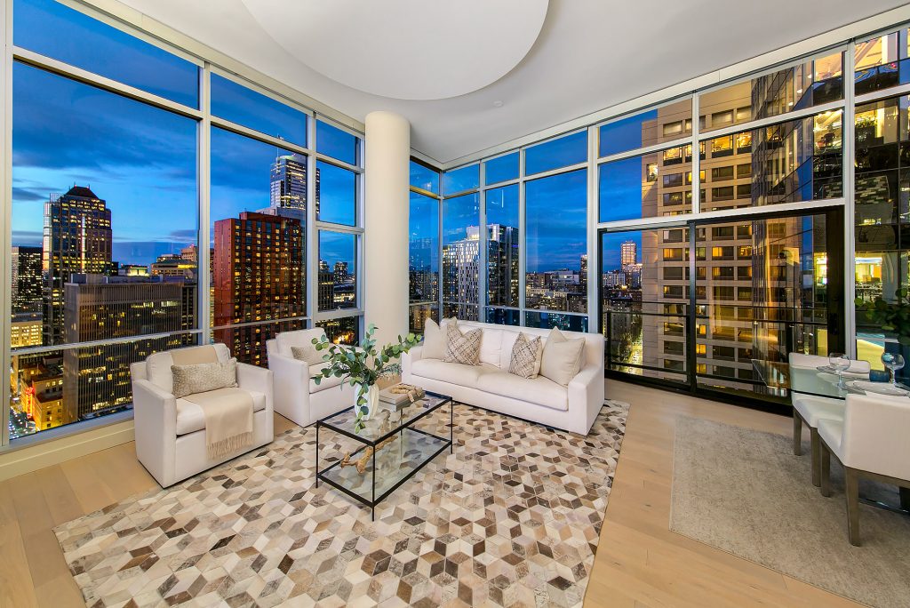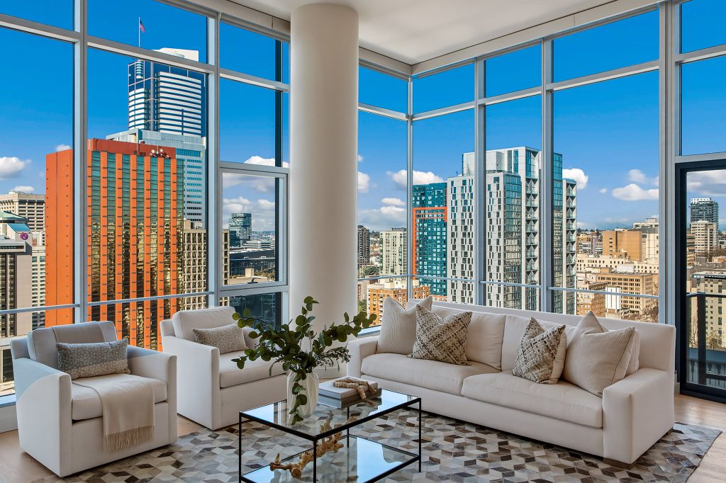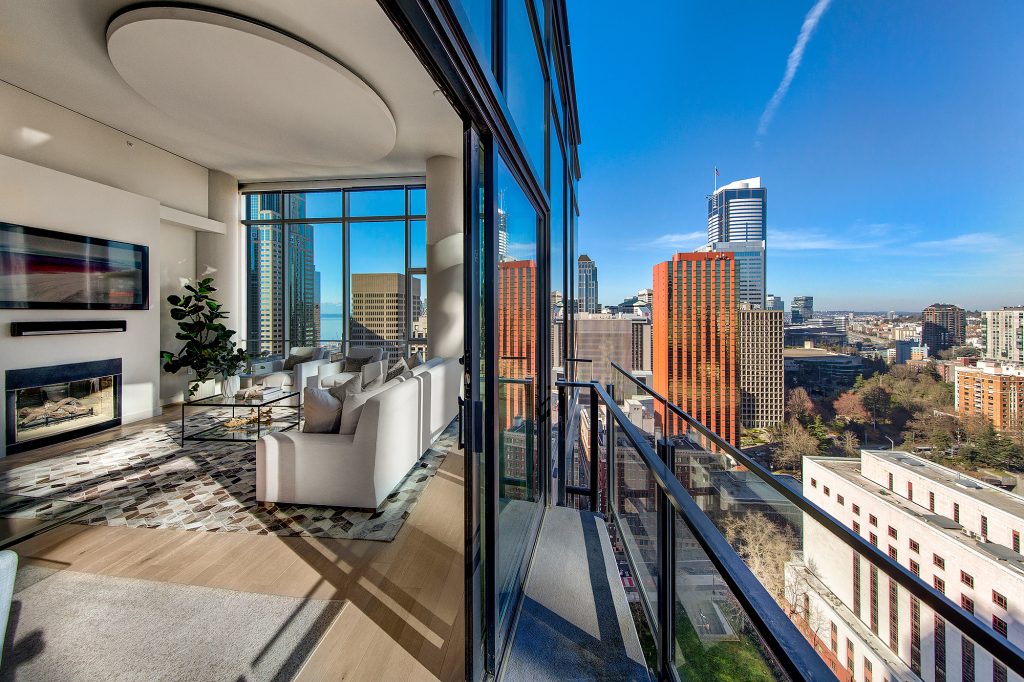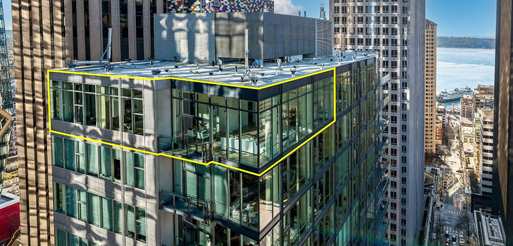 PENTHOUSE PERFECTION Rare 3 Bedroom, 2.5 Bath Corner Residence. A stunning jewel box in the sky, this oversized corner penthouse showcases soaring 12 foot walls of glass & panoramic views of Seattle's iconic skyline. Designed for exceptional entertaining, the grand open floor plan blends spaciousness with refined elegance, offering breathtaking views from every angle. Arrive home in style, luxurious marble foyer with ample space to showcase your favorite art collections. Gourmet kitchen is a dream for the budding chef, featuring gas cooking, top-tier appliances, solid wood cabinetry, abundant storage, and a large walk-in pantry. Beautiful wide-plank flooring flows seamlessly throughout the home. Sophisticated finishes found in every room. Dramatic Ramplause 12 foot glass doors enhance a sleek private touch to bedroom / home office spaces. Wake each morning to glorious sunrises and unwind to magical sunsets. The private primary suite is a true retreat, complete with floor-to-ceiling windows, an oversized walk-in closet, deep soaking tub, double vanity, frameless oversized shower & a closet dedicated for additional storage. This modern smart home features include automated lutron, wireless A/V integration, & a smart TV w/rotating art display. 5th&Madison is located in the heart of Seattle's financial dist, enjoy premier restaurants, renowned architecture just outside your door. EZ access to I-5, Bainbridge Ferry, hospitals, stadium events, Seahawk parades! 2pk, 2storage.