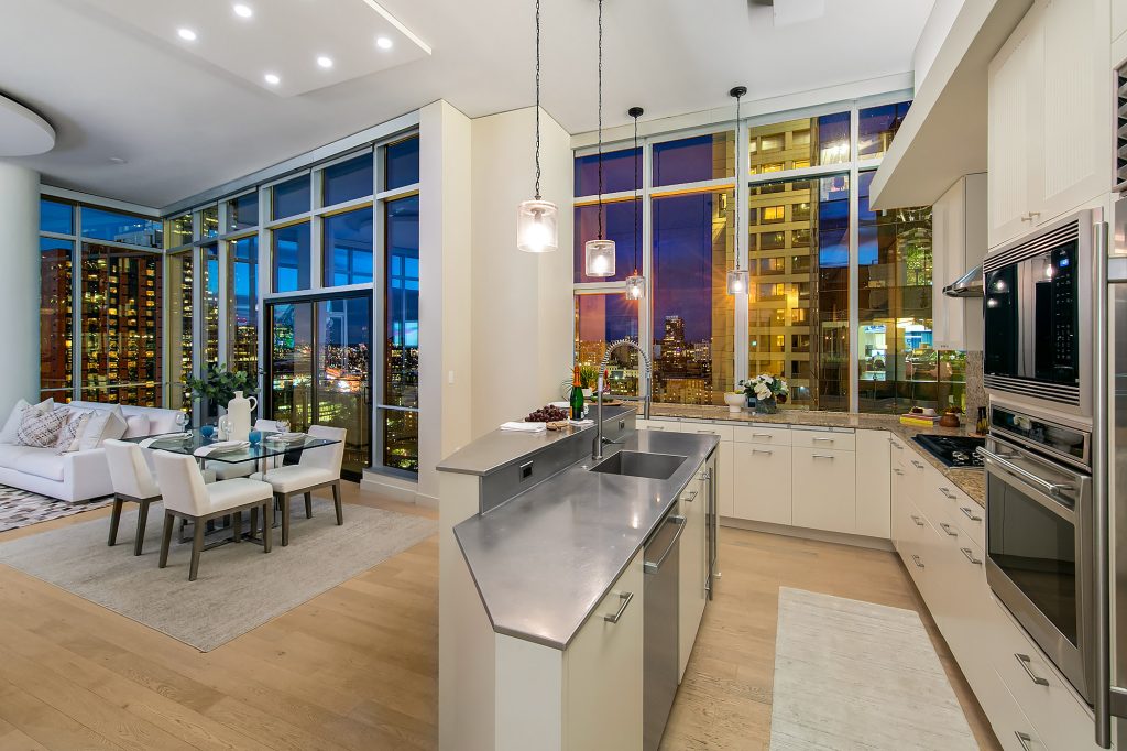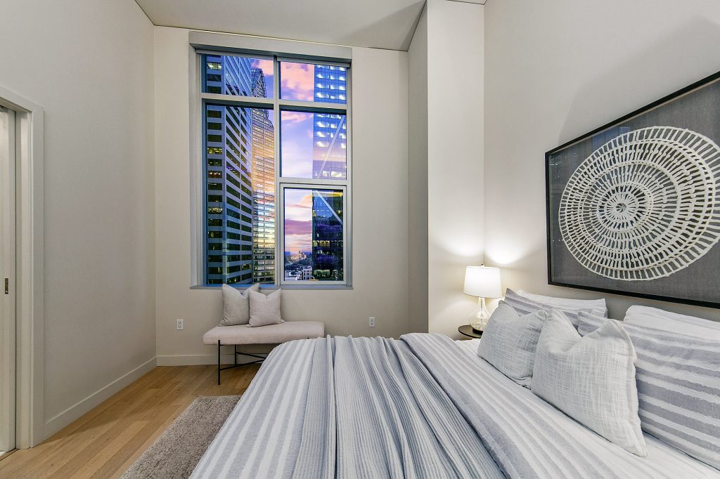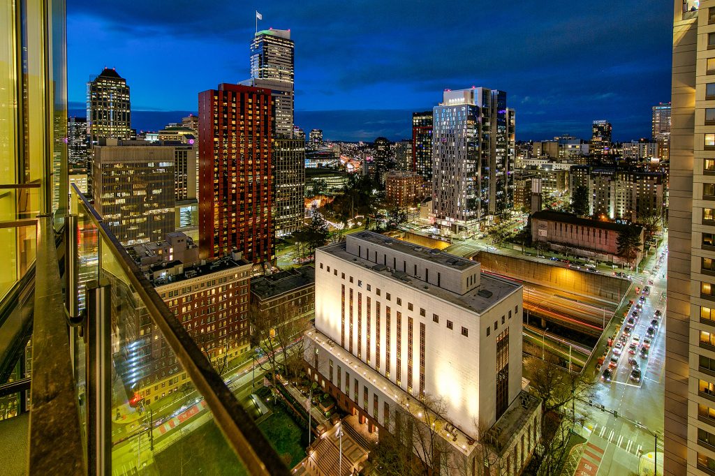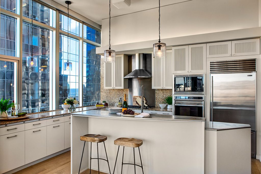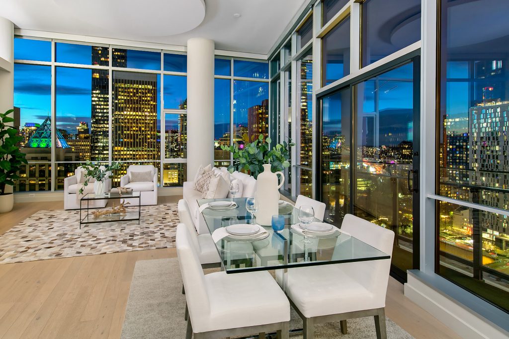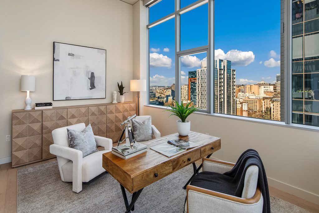 PENTHOUSE PERFECTION Rare 3 Bedroom, 2.5 Bath Corner Residence. A stunning jewel box in the sky, this oversized corner penthouse showcases soaring 12 foot walls of glass & panoramic views of Seattle's iconic skyline. Designed for exceptional entertaining, the grand open floor plan blends spaciousness with refined elegance, offering breathtaking views from every angle. Arrive home in style, luxurious marble foyer with ample space to showcase your favorite art collections. Gourmet kitchen is a dream for the budding chef, featuring gas cooking, top-tier appliances, solid wood cabinetry, abundant storage, and a large walk-in pantry. Beautiful wide-plank flooring flows seamlessly throughout the home. Sophisticated finishes found in every room. Dramatic Ramplause 12 foot glass doors enhance a sleek private touch to bedroom / home office spaces. Wake each morning to glorious sunrises and unwind to magical sunsets. The private primary suite is a true retreat, complete with floor-to-ceiling windows, an oversized walk-in closet, deep soaking tub, double vanity, frameless oversized shower & a closet dedicated for additional storage. This modern smart home features include automated lutron, wireless A/V integration, & a smart TV w/rotating art display. 5th&Madison is located in the heart of Seattle's financial dist, enjoy premier restaurants, renowned architecture just outside your door. EZ access to I-5, Bainbridge Ferry, hospitals, stadium events, Seahawk parades! 2pk, 2storage.